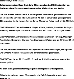 Das EVS Kunden-Service-Center ist an Heiligabend und Silvester geschlossen und vom 27.12. bis 30.12. von 8 bis 16.30 Uhr geöffnet. Ab dem 1. Januar 2023 gelten geänderte Öffnungszeiten für das Kunden-Service-Center: Montag bis Freitag von 8 Uhr bis 16.30 Uhr. Die EVS Wertstoff-Zentren Blieskastel, Illingen, Köllertal, Losheim, Nohfelden, Rehlingen- Siersburg, Saarwellingen und Sulzbach bleiben vom 24.12. bis 31.12.2022 geschlossen.