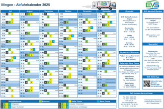 Alle Abfuhrtermine für das gesamte Jahr 2025 sind schon jetzt online unter www.evs.de/abfuhrtermine sowie in der EVS Abfall-App verfügbar, die kostenfrei in den App-Stores heruntergeladen werden kann. Alle Änderungen sowie Feiertagsverschiebungen sind bereits in den hier veröffentlichten Kalendern berücksichtigt.