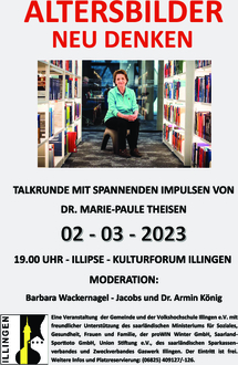 Auch in 2023 geht unsere Reihe „Altersbilder: neu denken“ weiter: wir stellen jeden Monat Frauen und Männer vor, die ihr eigenes Leben im Älterwerden spannend und ungewöhnlich gestalten, die aber auch zu einem wichtigen Thema erzählen können. Der diesjährige Auftakt ist am Donnerstag, den 2. März 2023 um 19 Uhr im Kulturforum Illipse. Armin König und Barbara Wackernagel-Jacobs unterhalten sich mit Dr. Marie-Paule Theisen. Die Luxemburgerin begann mit 66 Jahren, während sie noch als Grundschullehrerin gearbeitet hat, ein Studium der Gerontologie (Wissenschaft vom Prozess des Alterns), hat es abgeschlossen und im Alter von 75 promoviert. Heute, mit 80, ist sie Dozentin an der Universität in Luxemburg. „Alter ist kein Schicksal, aber man muss etwas dazu tun“ ist einer ihrer Grundgedanken - sie wird von ihren Erfahrungen und Erkenntnissen erzählen, von der Fähigkeit des menschlichen Hirns, sich in jedem Alter zu regenerieren und von dem Nutzen der ‚achtsamkeitsbasierten Stressreduktion’.