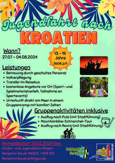 Zur Freizeitgestaltung wird es unter anderem kostenlose Angebote vor Ort geben, aus denen ihr wählen könnt. So gibt es beispielsweise einen Sport-und Spielmaterialverleih, der genutzt werden kann und auch vielfältige Sportturniere. Um Kroatien noch besser kennenzulernen, werden wir Ausflüge nach Pula und nach Rovinj unternehmen. Ein Ausflug nach Pula bietet neben kulturellen Höhepunkten vielseitige Einkaufsmöglichkeiten in den Gässchen der Altstadt, sowie nette Cafés und gemütliche Plätze zum Verweilen. Rovinj ist das Städtchen mit der längsten Uferpromenade Istriens und bietet beeindruckende Hafenansichten. In der auf einem Hügel gelegenen Altstadt von Rovinj findet ihr nette kleine Läden und Cafés. Abenteuerlust ist gefragt, wenn wir mit dem Mountainbike das hügelige Hinterland Istriens entdecken. Bevor es ins Camp zurückgeht, können wir uns in einer traumhaften Bucht erholen und schnorcheln. Natürlich werdet ihr aber auch genügend Zeit zu eurer freien Verfügung haben. Mitbringen müsst ihr einen Schlafsack, ein Spannbetttuch, ggf. ein Kissen, eine Lunchbox, Trinkbecher, Geschirr und Besteck. Weitere Informationen findet ihr im Plakat.