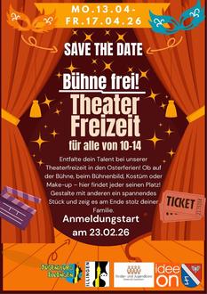 Du liebst es, in andere Rollen zu schlüpfen, zu improvisieren und mit anderen zusammen eine spannende Geschichte auf die Bühne zu bringen? Dann ist unsere Theaterfreizeit in den Osterferien genau das richtige für dich! Die Theaterfreizeit richtet sich an alle kreativen Köpfe im Alter von 10 - 14 Jahren - Ganz egal ob du schon Bühnenerfahrung hast oder zum ersten Mal auf der Bühne stehen möchtest - hier findet jeder seinen Platz! Du kannst als Darsteller*in an deiner Schauspieltechnik und dem Umgang mit der Bühne arbeiten. Als Bühnenbildner*in bist du eher hinter den Kulissen aktiv. hier ist handwerkliches Geschick und kreative Vorstellungskraft gefragt, wenn du das Bühnenbild baust um das Theaterstück mit Requisiten zum Leben erwachen lässt. Als Kostümdesigner*in und Visagist*in kleidest und schminkst du die Darsteller*innen ihrer Rollen entsprechend. Am Ende gibt es natürlich eine Vorstellung für eure Familien. Werde Teil der Ferienfreizeit! Die Anmeldung startet ab 23.02.2026 ab 08:00 Uhr online unter www.ferienprogramm-illingen.de.