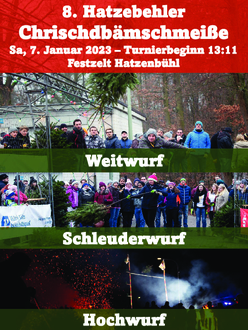 Am Samstag, den 7. Januar 2023 ab 13:11 Uhr, trifft man sich beim „Hatzebehler Chrischdbämschmeiße“ am Festzelt in Hatzenbühl nun schon zum 8. Mal, um Tannenbäume möglichst weit und hochzuwerfen. Das lustige Event hat sich mittlerweile in vielen Dörfern in der Südpfalz herumgesprochen, sodass sich das Teilnehmerfeld längst nicht mehr nur aus einheimischen Hatzenbühlern zusammensetzt. Unterschiedlichste Kleidungsstile - vom Krönchen bei den Damen, über Schuhe mit Spikes und Arbeitshandschuhen bei den Herren - zeigen außerdem die Kreativität der Teilnehmer, beim Versuch neue Höchstleistungen zu erreichen. Über 10 Meter weit und 5 Meter hoch wurden die Bäume in den letzten Jahren in den 3 Disziplinen Weit-, Schleuder- und Hochwurf befördert. Auch Frauenteams haben sich in diesem Jahr erfreulicherweise wieder angemeldet, was uns zeigt, dass es dabei nicht nur auf Kraft, sondern auch auf eine gewisse Technik ankommt.