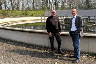 Von links nach rechts: Dirk Kröger, Leiter der Zentralkläranlage, und Karl Dieter Wünstel, Bürgermeister der Verbandsgemeinde Jockgrim an der Zentralkläranlage VG-Jockgrim in Rheinzabern. Im Hintergrund wird die 4. Reinigungsstufe der Kläranlage entstehen.