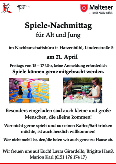 Im April findet die Sprechstunde an folgenden Terminen im Nachbarschaftsbüro der Malteser (Lindenstr. 5) statt: