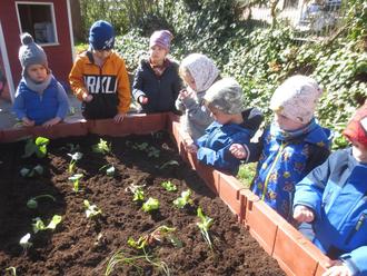 Nachdem das Beet wieder ordentlich mit Erde befüllt war, durften die „älteren“ Kinder der Schmetterlingsgruppe (vor deren Gruppe steht das Hochbeet) mithelfen: Es wurden Löcher gegraben und die verschiedenen Setzlinge eingepflanzt: Es gab Erdbeeren, Kopfsalat, Pflücksalat, Kohlrabi, Mangold, rote Beete und eine Gurkenpflanze.