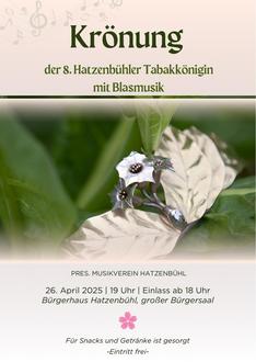 Der Musikverein Hatzenbühl lädt alle Freunde der Blasmusik recht herzlich zur Krönung der 8. Hatzenbühler Tabakkönigin in das Dorfgemeinschaftshaus ein.