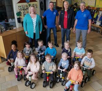 Vom Erlös des 2. Hatzenbühler Wendelinusmarktes im Dezember 2023 spendete der Radfahrerverein Rosalia 10 Puky Wutsch Kinderfahrzeuge an die Kita. Klaus Kern, Inhaber von Zweirad Kern, hat die Spende nochmals um 2 weitere Räder aufgestockt. Somit kann jetzt jede unserer 6 Gruppen zwei Puky Fahrzeuge „ihr eigen“ nennen.