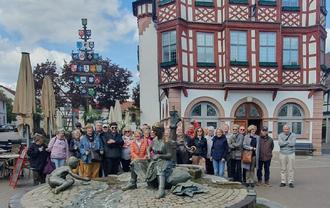Am Sonntagmorgen ging es dann für die französischen Gäste und eine größere Anzahl an deutschen Mitgliedern mit dem Bus nach Lorsch. Dort konnten wir uns bei einer gemeinsamen Stadtführung einen ersten Überblick verschaffen. Neben kunstvoll verzierten Brunnen, Gebäuden und Räumen gab es eine Gemeinsamkeit festzustellen - der Tabakanbau, war auch hier ein zentrales Element. Zum Mittagessen gingen wir an unseren Bus, der voll beladen mit Getränken, Fleischkäse, Kaffee und Kuchen war. Gemeinsam wurden hierfür Garnituren gerichtet, um in der Sonne ein Picknick zu genießen. Frisch gestärkt ging es danach weiter mit je einer Führung in Deutsch bzw. in Französisch zum Kloster in Lorsch, einem Weltkulturerbe, weiter. Nach spannenden Erzählungen rund um die Geschichte von Lorsch und dem Kloster, ging es dann auch schon wieder zurück nach Hatzenbühl.