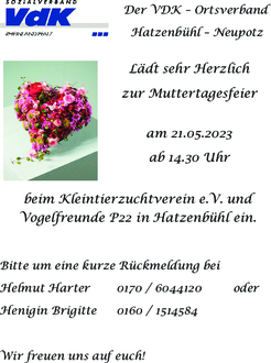 Unsere Jahreshauptversammlung findet dieses Jahr beim Kleintierzuchtverein und Vogelfreunde P22 e.V. in Hatzenbühl ab 14.00 Uhr statt.