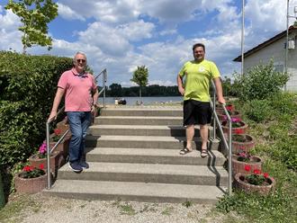 Wie Sie auf dem Foto erkennen können, gibt es nun auch ein Treppengeländer aus Edelstahl, damit es den Badegästen etwas leichter fällt, die Treppe rauf oder runter zu gehen. Dieses tolle Geländer wurde von einigen Einwohnern gewünscht und unser Baggerseeteam ist froh, dass dieser Wunsch nun in Erfüllung gegangen ist. Unser Angelsportverein, der ASV Jockgrim, hat dieses Geländer für die Ortsgemeinde und für die Besucher gestiftet. Ortsbürgermeister German Guttenbacher bedankt sich beim 1. Vorsitzenden, Herrn Michael Fuhr, im Namen der Ortsgemeinde recht herzlich dafür.