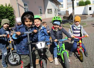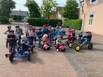 So konnten die Kinder an einem vorher bekannten Tag ein Fahrzeug nach Wahl von zu Hause mitbringen: Roller, Laufräder, Traktoren mit und ohne Anhänger, Kett-Cars, Laufräder, Bobby-Cars und vieles mehr wurde vor der Kita geparkt.