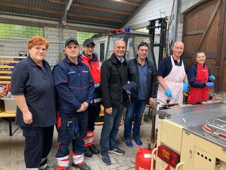 Bürgermeister Karl Dieter Wünstel (Kreisbeauftragter der Malteser) und Ortsbürgermeister Karlheinz Henigin machten sich bei einem Besuch in der Halle der Malteser ein Bild von den Kocheinsätzen. Sie bezeichneten die Verpflegung der Einsatzkräfte als logistische Meisterleistung: „Angefangen von der Beschaffung der großen Mengen an Lebensmitteln und Getränken über das Kochen mit Hilfe der in die Jahre gekommenen Feldküche bis hin zu Verteilung des Essens und der Getränke zu allen Tages- und Nachtzeiten trägt die Verpflegungsgruppe maßgeblich zum Gelingen der Hochwasserschutzeinsätze bei.“, fasste Wünstel zusammen und bedankte sich für die engagierte und strategisch gut geplante Umsetzung.