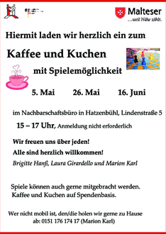 Im Juni findet die Sprechstunde an folgenden Terminen im Nachbarschaftsbüro der Malteser (Lindenstr. 5) statt: