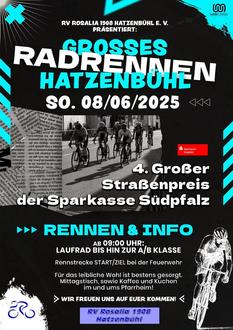Radfahrerverein Rosalia 1908 Hatzenbühl Radrennen, 4. Großer Straßenpreis der Sparkasse Südpfalz. Am 08.06.2025 findet in Hatzenbühl wieder unser traditionelles Radrennen auf der letztjährigen Rennstrecke statt. Der Start- und Zielbereich befindet sich wieder in der Nähe des Feuerwehrhauses in der Luitpoldstraße (gegenüber Metzgerei Scherer). Von dort geht es über die Lindenstraße, am Friedhof links ins Bildstöckel und über die Lange Gewanne wieder zurück zur Luitpoldstraße. Die Radrennstrecke ist an diesem Tag für den öffentlichen Straßenverkehr gesperrt, Umleitungen sind ausgeschildert. An der kompletten Rennstrecke gilt ab Sonntag, 08.06., um 08:00 Uhr absolutes Parkverbot. Wir danken jetzt schon für das Verständnis der Anwohner. Es besteht für alle Rennklassen eine Startmöglichkeit. Es gibt wieder einen Einlagewettbewerb für Menschen mit Behinderung unter der Schirmherrschaft von Dr. Thomas Gebhart. Im Anschluss beginnen die Rennen für unsere jüngsten Teilnehmer von Laufrad bis Fette Reifen, hier hat die Schirmherrschaft der Bürgermeister der Verbandsgemeinde Karl Dieter Wünstel. Das Hauptrennen wird um 17:00 Uhr gestartet. Selbstverständlich ist für das leibliche Wohl wie gewohnt gesorgt: Wir laden Sie ein zum Mittagstisch: Es gibt Rollbraten mit Pommes und Salat, sowie Zwiebelsteak, gute Hatzebehler Bratwurst und Wurstsalat. Für unsere Vegetarier bieten wir Rigatoni mit Tomatensoße an. Den ganzen Tag gibt es Kaffee, Kuchen und Crêpes. Selbstverständlich wird es auch an gut gekühlten Getränken, u. a. frisch gezapftes Bier der Göcklinger Hausbrauerei, nicht fehlen. Die gesamte Bevölkerung ist zu diesem Radsport-Event herzlich eingeladen. Ein herzliches Dankeschön jetzt schon an die vielen Helfer und Spender, ohne die dieses Radsport-Ereignis nicht möglich wäre.