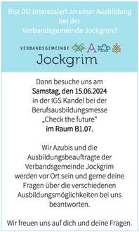 Die Verbandsgemeindeverwaltung präsentiert sich am Samstag, 15.06.2024 von 10:00 - 13:00 Uhr zusammen mit 70 weiteren Ausbildungsbetrieben bei der Berufsausbildungsmesse „Check the future“ an der IGS Kandel.