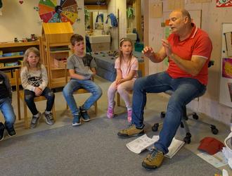 In der Schmetterlingsgruppe ist das aktuelle Thema Bienen. Deshalb besuchte uns in der vergangenen Woche der Hobby-Imker Manfred Werling. Zuerst hatte er uns anhand einiger Bilder die Entwicklung und den Lebenszyklus der Biene erklärt, wie lange eine Biene lebt und welche Aufgaben eine Arbeiterbiene in welchem Alter zu erledigen hat.