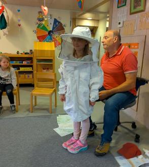Manfred hatte einen Rahmen mit Waben aus einem seiner Bienenstöcke dabei und auch verschiedene Werkzeuge, die ein Imker für seine Tätigkeit braucht. Außerdem brachte er einen Imker-Schutzanzug mit Hut und Netz mit, welchen die Kinder sogar anprobieren durften.