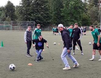 Schon seit einiger Zeit hatte Denys M. den Wunsch an einem Fußballspiel teilnehmen zu können. Auf Vermittlung von Willi Hellmann und Anleitung des Trainers Marc Kauther konnte Denys, trotz seiner Gehbehinderung, an einer Trainingseinheit der Mannschaft teilnehmen.