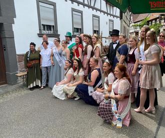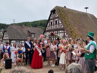 Auf Einladung vom Dornröschen Adina I. fuhren unsere 7. Hatzenbühler Tabakkönigin Elisa I. und die aktuelle Zeiskamer und Pfälzische Zwiebelkönigin Nathalie I. am 08. Juni 2024 zum Dornröschenfest nach Dörrenbach. Gerade noch konnten sie am Ortseingang vor dem Haus einer netten Familie einen Parkplatz ergattern. „Bezahlt“ wurde dieser Parkplatz mit den Autogrammkarten der beiden Hoheiten. Dann ging es gleich weiter zum Treffpunkt Café Röschen nebenan, wo Adina I. und weitere Gasthoheiten bereits warteten. Darunter das Ottersheimer Bärenpaar Sabine und Jürgen, der Bellheimer Lord Kurt, das Knillsemer Kätzel Melina I., die Weinprinzessin der Südlichen Weinstraße Offenbach Lea I., die Graben-Neudorfer Spargelhoheiten Jasmin und Martin und viele andere. Zur Überraschung aller Gasthoheiten erhielt jede Hoheit entsprechend ihres Titels ein vom Dornröschen selbstgemaltes Bild, wie z.B. ein Bild mit Tabakblättern und einer Krone für unsere Tabakkönigin. Elisa nutzte auch die Gelegenheit, die anwesenden Gasthoheiten zum Tabak-Einlese-Wettbewerb des Musikvereins Hatzenbühl am Sonntag, 25. August einzuladen. Nach einem Gruppenbild mit Landrat Dietmar Seefeldt startete das angekündigte Stationen-Theater am Dorfbrunnen von Dörrenbach. Viele Besucherinnen und Besucher gingen mit den Hoheiten auf der engen Dorfstraße von Station zu Station bis hinauf zum Platz vor der Wehrkirche. Dort wurde entsprechend des Märchens das Dornröschen von dem Königssohn wachgeküsst.