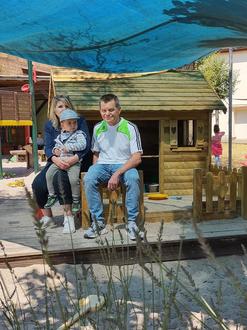 Dankeschön an Annemarie und Roland Seither, Inhaber der Praxis für Physiotherapie Jockgrim. Von dem Geld wurde ein Spielhaus gekauft. Das Haus mit dazugehöriger Veranda hat Platz für mehrere Kinder und lädt zum Spielen, Sandeln und Verweilen ein.