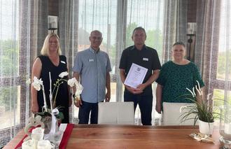 Joachim Keiber mit der Ernennungsurkunde im neu gestalteten Trauturm der Verbandsgemeinde Jockgrim: v.l.n.r.: Sibylle Glittenberg (Personalreferentin), Bürgermeister Karl Dieter Wünstel, Joachim Keiber, Martina Bouché (Leiterin Abteilung Bürgerservice)
