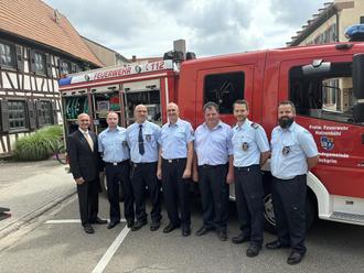 von links nach rechts: Bürgermeister Karl Dieter Wünstel, Wehrführer Pascal Werling, stellv. Wehrführer Bernd Hermann, ehemaliger Wehrführer Norbert Werling, ehemaliger stellv. Wehrführer Hubert Henigin, Wehrleiter Alexander Scharf, stellv. Wehrleiter David Hoffmann