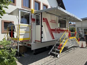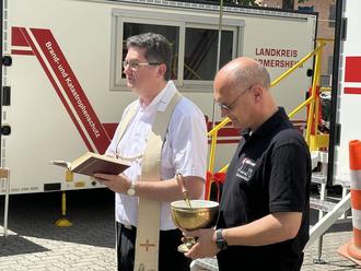 Am Samstag, den 21.06.2025, wurde das neue Küchenmodul an die SEG-Verpflegung der Malteser Hatzenbühl feierlich übergeben, in Dienst gestellt und von Pfarrer Marco Richtscheid gesegnet. Dank des Engagements des Landkreises und der Kreisverwaltung konnte das Modul beschafft werden. Es ersetzt die alte Feldküche. Ausgestattet mit modernen Geräten und viel Bewegungsfreiheit, ermöglicht es das Arbeiten von mehreren Helfern gleichzeitig. Das Modul ist auf einem großen Anhänger verlastet und verfügt über einen klappbaren Anbau sowie eine Plattform mit Treppe. Ein Fenster mit klappbarer Theke und ein Zeltvorbau schützen den Ausgabebereich. Das Küchenmodul wiegt zusammen mit dem Anhänger um die 5 Tonnen.
