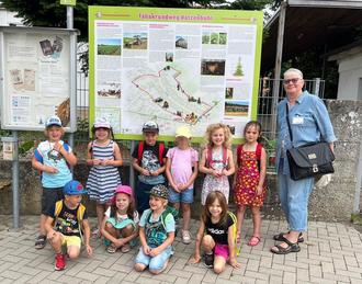 Außerdem liefen wir mit unseren Wackelzähnen einen Teil des Hatzenbühler Tabakrundweges und besuchten einen Tabakschuppen. Unsere Wackelzähne wurden in 2 Gruppen aufgeteilt, damit wir an zwei Vormittagen gehen konnten. Treffpunkt war am Pfarrgarten, wo auch der Rundweg beginnt. Auch der Tabakrundweg veranschaulicht anhand mehrerer Informationstafeln das gesamte Vegetationsjahr des Tabaks. Emi Wünstel begleitete uns an beiden Tagen mit ihrer fachkundigen Führung und konnte uns Einiges dazu sehr kindgerecht erzählen und erklären.