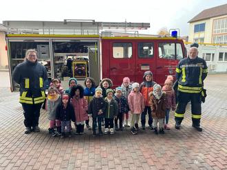 An einem Vormittag waren Nina und Elmar Kaufmann mit einem Feuerwehrauto der Hatzenbühler Feuerwehr am Bürgerplatz. Sehr kindgerecht wurden die verschiedenen Funktionen des Fahrzeugs erklärt, die Kinder konnten sich ins Auto setzen, durften erleben, wie es ist, wenn ein Feuerwehrmann eine Atemschutzmaske aufzieht und wer wollte, konnte auch eine Feuerwehrjacke und einen Helm aufziehen.