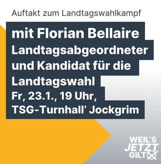 Die CDU der Verbandsgemeinde Jockgrim lädt alle interessierten Bürgerinnen und Bürger ein zum Auftakt in den Landtagswahlkampf am Freitag, 23.1.26, um 19 Uhr in der TSG-Turnhall‘ in Jockgrim (Ludwigstr. 161) mit Landtagskandidat Florian Bellaire, Dr. Thomas Gebhart und Martin Brandl.