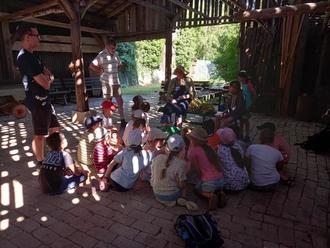 Das High-Light des Vormittags stand schon kurz vor der zweiten Infotafel, nämlich der Tabakschuppen der Gemeinde Hatzenbühl, der von der Arbeitsgruppe Tabakrundweg bei Führungen geöffnet werden darf. Im angenehmen Schatten konnten die Kinder erst mal ihre Pausenbrote essen und etwas trinken.