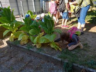 Damit das Ganze für die Kinder auch anschaulich wurde, konnten sie gleich an den Tabakpflanzen im Pfarrgarten ausprobieren, wie die Tabakernte, das sogenannte Tabak brechen in der Praxis funktioniert.