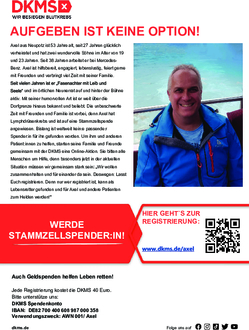 Axel aus Neupotz hat Lymphdrüsenkrebs. Eine Stammzellspende ist seine einzige Überlebenschance. Bislang ist die weltweite Suche nach einem „genetischen Zwilling“ erfolglos. Axels Familie und Freunde organisieren eine große online Registrierungsaktion. Wer gesund und zwischen 17 und 55 Jahre alt ist, kann sich unter www.dkms.de/axel ein Registrierungsset nach Hause schicken lassen.