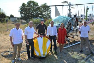 v.l.n.r. Dirk Reichle (Wissenschaftlicher Direktor der KABS), Karl Dieter Wünstel (Bürgermeister der VG Jockgrim), Mike Schönlaub (Brand- und Katastrophenschutzinspekteur des LK Germersheim), Landrat Dr. Fritz Brechtel, Iris Fleisch (Bürgermeisterin VG Hagenbach) und Pilot Wolfgang Folger