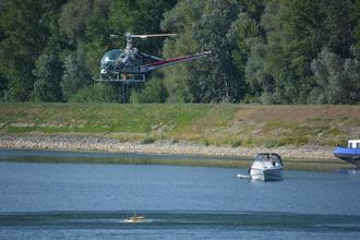 Der Hubschrauber "tankte" mehrfach rund 500 Liter Löschwasser mittels Faltkorb (Außenlastbehälter) aus dem Germersheimer Hafenbecken und ließ es in mehreren Durchgängen wieder über dem Hafengelände ab. Pilot Wolfgang Folger, Geschäftsführer der Fa. Heli Air Alpine, der unter anderem im Auftrag der KABS im Rahmen der Stechmückenbekämpfung tätig ist, gelang es auf sehr anschauliche Weise zu demonstrieren, dass ein Hubschrauber in der Lage ist, mittels entsprechendem Behältnis Wasser aus einer Löschquelle zu schöpfen und es dann auch zielgenau dort abzuwerfen, wo es beispielsweise bei der Bekämpfung von Waldbränden benötigt werde. Laut Folger können bis zu 800 Liter Löschwasser in speziellen Außenlastbehältern transportiert werden.