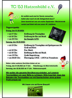 Am 01.09.2023 – 02.09.2023 feiern wir unser 40-jähriges Jubiläum auf unserem Tennisgelände und wollen hierzu die gesamte Bevölkerung einladen.