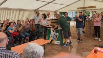 Am späten Samstagnachmittag setzte sich am Feuerwehrhaus in der Schillerstraße ein bunter Umzug in Bewegung: Freiwillige Feuerwehr, Musikverein, Delegationen von Vereinen, Vertreter aus der Kommunalpolitik und weitere Kerwefreunde geleiteten die farbenfroh geschmückte Birke zum Bürgerpark. Dort wurde sie von Mitgliedern der Freiwilligen Feuerwehr am Festzelt aufgestellt. Der Musikverein unter der Leitung von Fabian Metz spielte zur Eröffnung, Grußworte gab es von Tanja Hartmann im Namen der Schausteller, den Vertretern der Festwirte Daniel Dosch (Frohsinn) und Manuel Ditsch (Chaos Crew) und Ortsbürgermeisterin Sabine Baumann. Sie nahm dann auch mit Unterstützung von Bürgermeister Karl Dieter Wünstel, Kulturgemeinschafts-Vorsitzendem Michael Werling und Erstem Beigeordneten Ralf Seither den Fassanstich vor. Nach drei lauten Böllerschüssen des Schützenvereins Diana war die Jockgrimer Kerwe dann offiziell eröffnet.