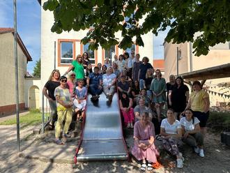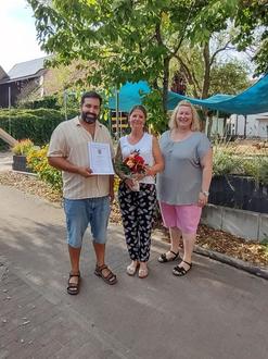 Am 17.8.24 hatte Miriam Knörr ihr 25jähriges Dienstjubiläum. Dieser Ehrentag wurde natürlich im neuen Kindergartenjahr nachgeholt. Miriam ist schon viele Jahre Leitung der Katzengruppe und übernahm zwischenzeitlich vor langer Zeit auch die Funktion der stellvertretenden Kita-Leitung. Als Dank gibt es unter anderem eine Urkunde und einen Blumengruß, der von unserem Bürgermeister Steffen Scherer überreicht wurde.