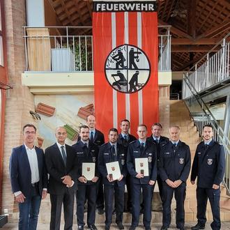 vorne v.l.n.r.: Christoph Buttweiler (1. Kreisbeigeordneter), Bürgermeister Karl Dieter Wünstel, Philipp Spandl, David Kupper, Simon Heid, Stephan Reis (Wehrleiter), Alexander Scharf (stellv. Wehrleiter) hinten v.l.n.r: Otto Rieder und Manfred Steiner (beide stellv. Wehrführer der FFW Rheinzabern), Jens Kiekebusch (Wehrführer FFW Jockgrim)