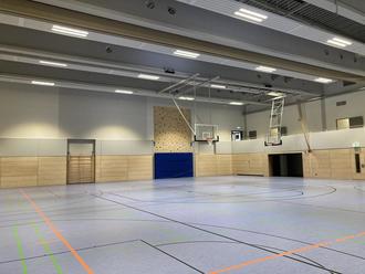 | • | Unter Berücksichtigung von Kriterien des Unfallschutzes wurde ein flächenelastischer Sportboden verlegt, nachgiebige Holz-Prallwände installiert, Sportgeräte angeschafft und eine Kletterwand eingebaut. |