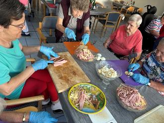 Die Betreuungskräfte und Bewohner*innen bereiteten gemeinsam einen leckeren Wurstsalat zu. Das Schneiden der Zutaten machte nicht nur Spaß, sondern förderte auch die Beweglichkeit der Teilnehmenden. Mit viel Freude und Teamarbeit entstand ein köstliches Gericht, das allen hervorragend schmeckte. Solche gemeinsamen Aktivitäten stärken den Zusammenhalt und bringen Abwechslung in den Alltag.