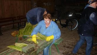 Getrennt nach den Tabaksorten Geudertheimer und Burley wurden die restlichen Blätter in Bürden und in einem mitgebrachten Radanhänger gesammelt. Die langen abgeernteten Tabakstumpen wurden aus dem Boden gerissen und wie die reifen Tabakblüten auf den Wagen geladen.