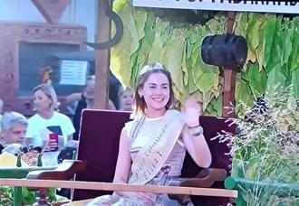 Auf dem Festwagen „450 Jahre Tabakanbau in Hatzenbühl“ präsentierte sich Elisa auf ihrem Thron vor dem nachgebildeten Tabaktrockenschuppen mit den vielen aufgehängten gelb-grünen Bandelieren.