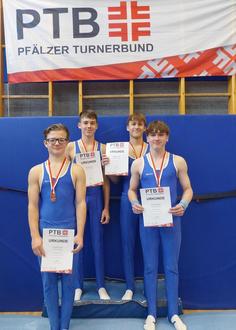 Es ist bei den Turnern schon Tradition: Im ersten Halbjahr stehen die Einzelmeisterschaften auf dem Programm, im zweiten Halbjahr die Mannschaftswettkämpfe. Vor 2 Wochen war der TV Hatzenbühl mit insgesamt drei Mannschaften bei den Gaumeisterschaften am Start. Zu den Pfalzmeisterschaften reichte es in diesem Jahr nur für die Kürturner. Unsere Kinder die im Pflichtwettbewerb starten, brauchen noch etwas Zeit meinte Trainer Gerhard Metz. Unsere Kürmannschaft musste zwar auf zwei Leistungsträger verzichten, schlugen sich aber dennoch sehr gut in einer leistungsstarken Konkurrenz. Der TV Bad Bergzabern (mit drei Turnern die in der 2. Bundesliga turnen), konnte sich erst am letzten Gerät vom TV Landau ( drei Turner in der 3. Bundesliga) absetzen und den Pfalzmeistertitel holen. Unsere Jungs konnten dennoch gegen beide Mannschaften eine Gerätewertung erzielen. Lukas Mendel, mit 13 Jahren der Jüngste im Hatzenbühler Team, überzeugte besonders an den Ringen, Barren und am Reck. Max Lang und Louis Flick (beide 16 Jahre), zeigten ihre stärksten Leistungen am Sprung und am Pauschenpferd. Mit 17 Jahren war Luis Sittinger der erfahrenste und an diesem Tag auch der erfolgreichste Punktesammler im Team. Da die Jungs nur zu viert am Start waren, musste jeder an allen sechs Geräten turnen. Mit einer so jungen Mannschaft den 3. Platz bei Pfalzmeisterschaften in der offenen Altersklasse – Respekt Jungs.