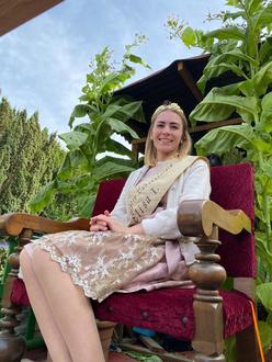 Auch im Namen des Musikvereins Hatzenbühl bedankte sich Elisa recht herzlich bei allen, die zum Gelingen, auch im Hintergrund, beigetragen haben. Insbesondere bei den Teilnehmenden der Fußgruppe, die den langen Weg gingen und auch den Wagen ausschmückten. Bei Daniel Henigin, der den Festwagen nach Neustadt und zurück transportierte und gekonnt und sicher den Wagen auf der Zugstrecke durch die Menschenmenge steuerte. Bei Doris und Hubert Henigin, die zusammen mit dem Königinvater Dieter Nauerth den Wagen nach neuen TÜV- und Brauchtumsrichtlinien herrichteten und wieder abbauten. Gleichzeitig ihren Hof, Schuppen und ihre Zeit zur Verfügung stellten. Nicht jeder angemeldete Motivwagen wurde laut Veranstalter für den Umzug zugelassen. Nicht zu vergessen: Familie Martina und Otto Weigel lieferten die beiden riesigen Tabakstauden links und rechts des Throns.