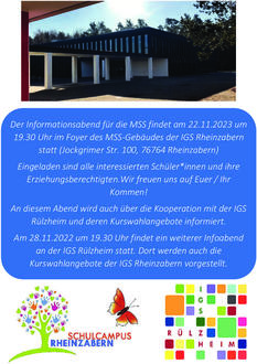 Der Informationsabend findet am 22.11.2023 um 19.30 Uhr im Foyer des MSS-Gebäudes der IGS Rheinzabern statt (Jockgrimer Str. 100, 76764 Rheinzabern). Die Oberstufenleitung und Schüler der Oberstufe informieren über Zugangsvoraussetzungen, Organisation der MSS, Abschlüsse und berufliche Perspektiven, die der Besuch der Oberstufe bietet.