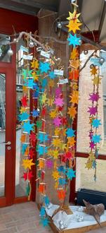 Eine Delegation der Bewohnerinnen und Bewohner brachte am 24.11.2022 zusammen mit Einrichtungsleiterin Jasmin Rink, Steffen Singer (Pflegedienstleitung des Seniorenhauses Babette Ludowici), Sandra Wimmer (Sozialer Dienst) sowie den Betreuungsmitarbeiterinnen Simone Frech, Christina Hausmann und Yannik Gabriel selbstgebastelte Sterne in der Verbandsgemeindeverwaltung in Jockgrim vorbei. Die Bewohnerinnen und Bewohner der der AWO-Seniorenhäuser in Jockgrim haben auf den Sternen Wünsche festgehalten, die jeder, der den Senioren eine Weihnachtsfreude bereiten möchte, seit Montag, 28.11.2022 vom Wunschbaum im Foyer der Verbandsgemeindeverwaltung „pflücken“ konnte.