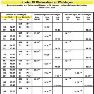 Ab Bahnhof Rheinzabern verkehrt um 14:36 Uhr die Fahrt 548-240 via Neupotz nach Kuhardt, die von der Verbandsgemeindeverwaltung Jockgrim initiiert wurde. Über die Bestandfahrt ab Rheinzabern, Schulzentrum um 14:28 Uhr wurde nun eine Heimfahrt auch nach der achten Unterrichtsstunde der IGS Rheinzabern mit drei-minütigem Umstieg am Bahnhof eingerichtet.