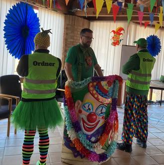 Mit einem großen „Hallo en de Verwaldung dere ganze Narreschar“ begrüßte Bürgermeister Karl Dieter Wünstel nach zweijähriger Zwangspause am Rosenmontag die närrischen Abordnungen aus den vier Ortsgemeinden sowie die Beigeordneten der Verbandsgemeinde, die Jockgrimer Ortsbürgermeisterin Sabine Baumann, den Neupotzer Ortsbürgermeister Roland Bellaire, die Rheinzaberner Ortsbürgermeisterin Alexandra Hirsch und die Seniorenbeauftragte Kathleen Fahrentholz. Für seine faschingsbegeisterten Gäste hatte er sich einen närrischen Gedankenrundgang durch das Gebäude der Verbandsgemeindeverwaltung einfallen lassen, denn in der Verwaltung gehe es das ganze Jahr über närrisch zu. Von der „Vergabeschdell“ aus beispielsweise „frochd die Verwaltung a in d ganze Welt „Was koscht’n Radiergummi?“ – erschd dann wird er beschdellt“. Mit einem Augenzwinkern nahm er weitere Themen der Verwaltung auf die Schippe, beispielsweise das Monitoring des Ministeriums, bei dem „gewooche, gezäihlt, beowacht und 's werd alles nodiert was vumm Steche um halwer sechse bis zum Feierowid um 20 Uhr bassiert“.