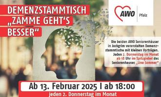 Der Demenzstammtisch "Zamme geht's besser" bietet jeden 2. Donnerstag im Monat um 18:00 Uhr im AWO Seniorenhaus Lina Sommer im Spietzgiebel einen Ort für Austausch und Unterstützung.